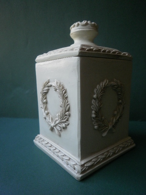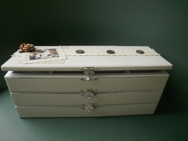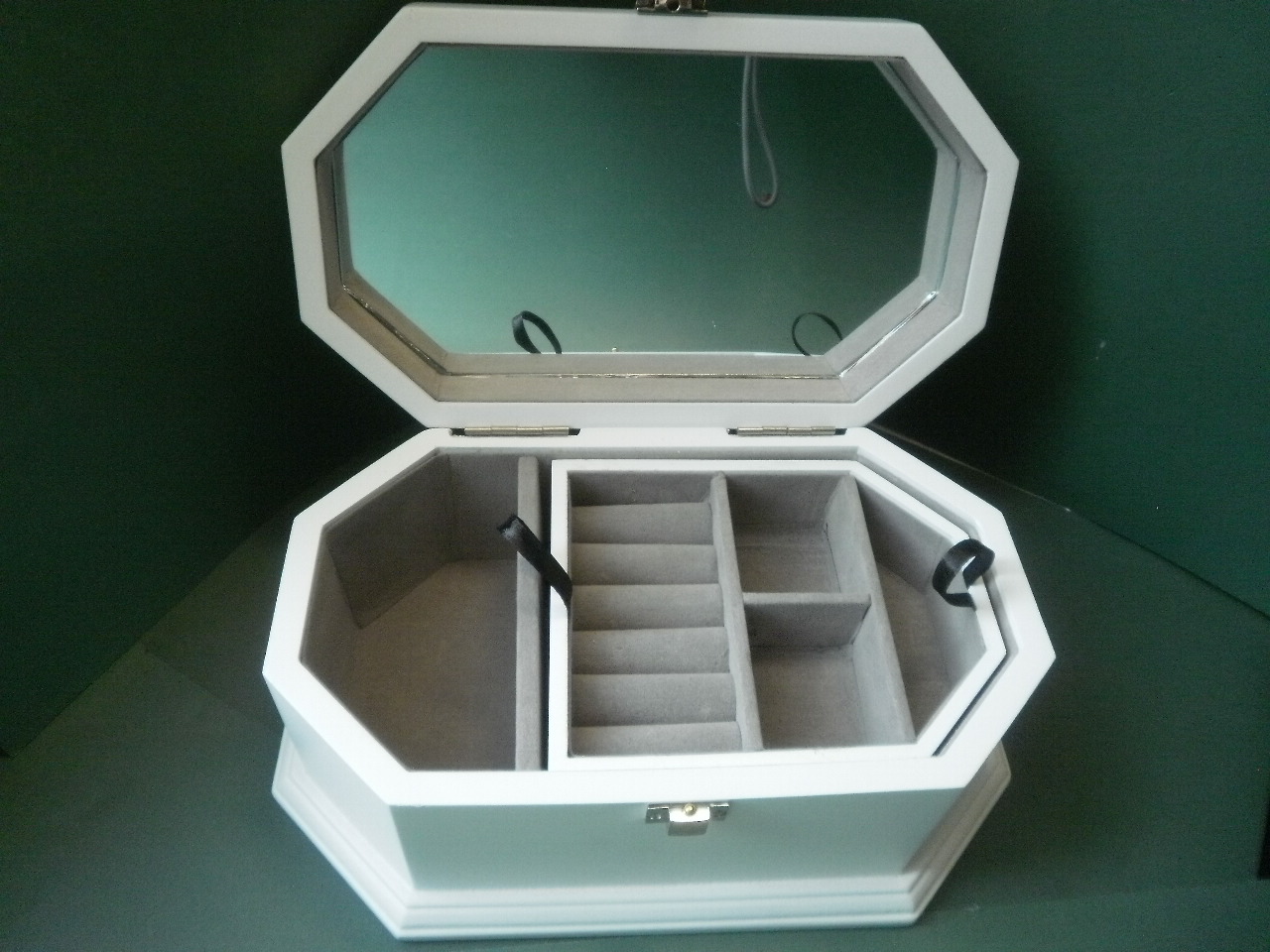 Fehér színű festett fa ékszertartó doboz, belül szürke bársonnyal borítva, 22x13x10 cm |