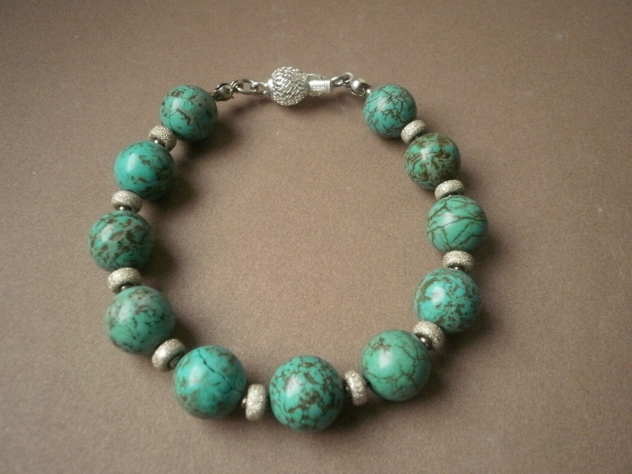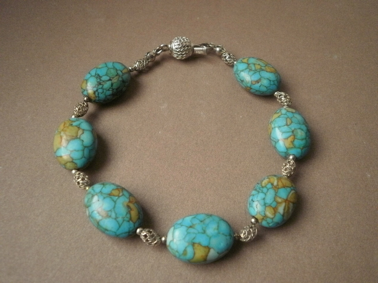 Rekonstruált türkiz ezüst karkötő, 925-ös sterling ezüstből, áttört mintás díszekkel, 21 cm hosszú |