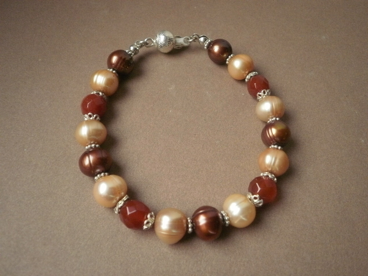 Pezsgő és csokoládészínű tenyésztett gyöngy karkötő karneol kövekkel és ezüst díszekkel, 925-ös sterling ezüstből, 20 cm hosszú |